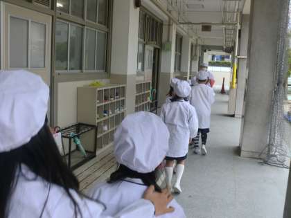 今週は食育週間です。今日は「ふれあい給食」を実施しました。1年生と6年生、2年生と4年生、3年生と5年生の交流給食です。1年生は、6年生のお兄さんが迎えに来てくれたら、とっても喜んで行きましたよ。