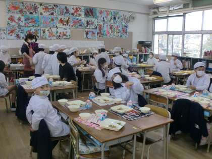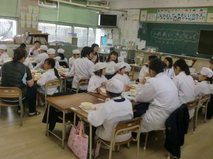 いつも美味しい給食を作ってくださっている給食調理員さんも、参加してくださいました。みんなで平等にお替りできる方法や、低学年でもピーマンや野菜も好き嫌いなく食べている様子を見て関心されていました。