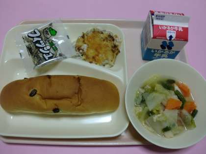 今日は久しぶりにレーズンパンです。残念ながら子どもの中には苦手な子も多いようです。子どもたちには、「レーズンは、不足しがちな鉄分があるし、給食のパンの中で高級なんですよ。」とお話しています。