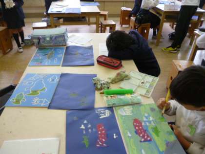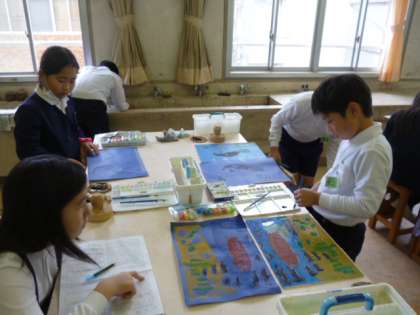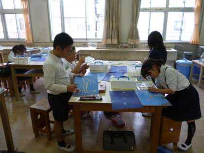 図工室で活動しています。魚の絵を描いて、彫刻刀で彫り、それに色をつけていきます。きれいな色に仕上がってきました。