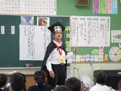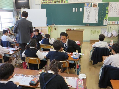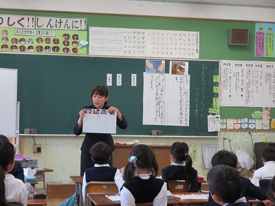2年生は、国語科「おもちゃリーフレットを作ってしょうかいし合おう」を学習しました。この日の学習めあては、生活科でつくった「おもちゃ」の作り方を 友だちに伝えるためのリーフレットを書くことです。学習時間の始めには、「せつ明はかせ」も登場し、