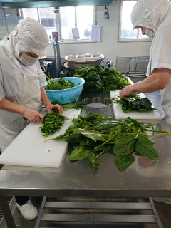 「さけのマリネ」は、塩、白こしょうで下味をつけ、でんぷんをまぶしてなたね油で揚げた角切りのさけに、たまねぎの入ったマリネ液をからませます。オリーブ油の風味をきかせています。