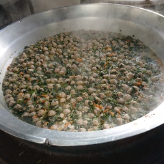 「肉だんごと麦のスープ」は、肉だんごと食物繊維の多い押麦を使ったスープです。旬のだいこん、ほうれんそうなどの野菜を使っています。彩りもよく、体が温まります。