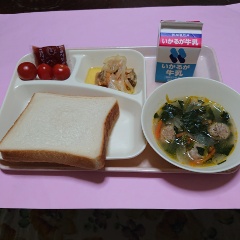 ☆さけのマリネ・肉だんごと麦のスープ・プチトマト・食パン・いちジャム・牛乳