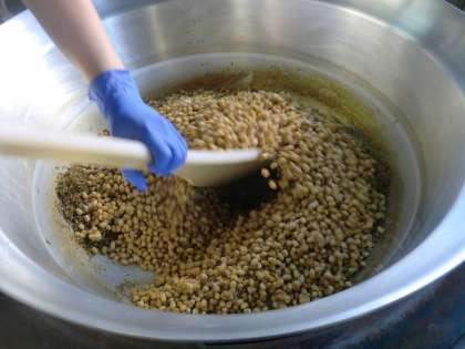 「じゃこ豆」は、ゆでたちりめんじゃことでんぷんをまぶし なたね油で揚げた大豆に、甘辛いタレをからませます。ごはんによく合う、かみごたえのある献立です。