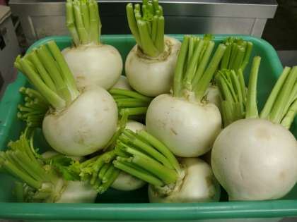 「かぶのゆず風味」は、焼き物機で蒸し、さっぱりとしたゆず風味のタレをかけてあえます。かぶは、優しい舌触りで、ゆずの良い香りがとても人気でした。