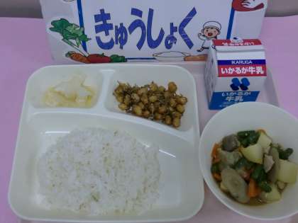 子どもたちは、この「じゃこ豆」が大好きで、前の日から献立表を見て「これおいしいやつや!」と言って楽しみにしていました。おはしをつけましたが、ちりめんじゃこはもちろんのこと、ごまも一粒も残さずきれいに食べている子が何人もいましたょ。