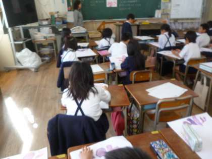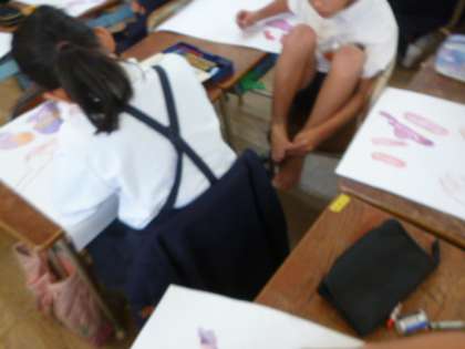 いもほりの絵を描いています。爪を見るために、くつしたをぬいで確認している人がいます。上手に描けてますよ。