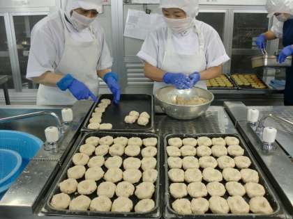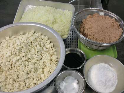 「とうふハンバーグ」は、 ツナ、とうふ、荒みじん切りのたまねぎ、調味料等を混ぜ合わせ、1人1コずつにまとめ、焼き物機で焼きます。北巽小学校では、約400個のハンバーグを1人1コずつ丁寧に小判型に形作っています。ハンバーグには、ケッチャップを1人1袋つけています。 また、アレルギーをもつ児童生徒に配慮し、鶏卵、練りごまは使用していません。