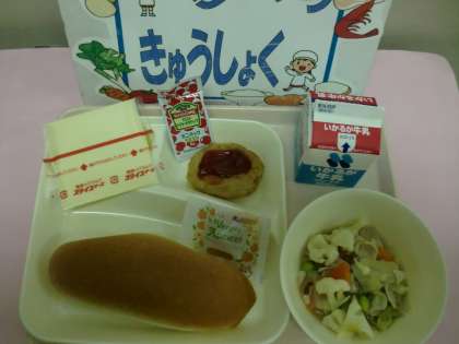 ☆とうふハンバーグ・カリフラワーのスープ煮・スライスチーズ・コッペパン・アプリコットジャム