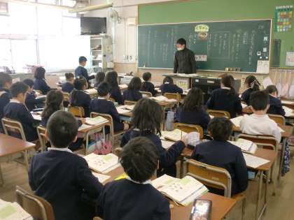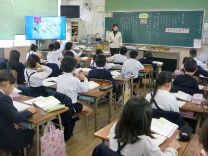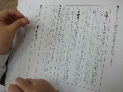 「七草がゆ」について、教科書や栄養教諭の話を聞いて「なぜ七草がゆを食べるのか」を考えていきました。七草は、寒い時期に不足しやすいビタミン等を、春に芽吹く生命力とともに体に取り込んできた昔の人の知恵です。1月7日は、五節句のうちのひとつ「人(じん)日(じつ)の日」で人を大切にする日であることからこの日に1年健康に過ごせるように食べます。
