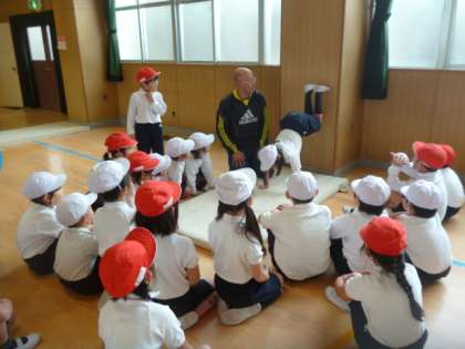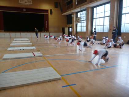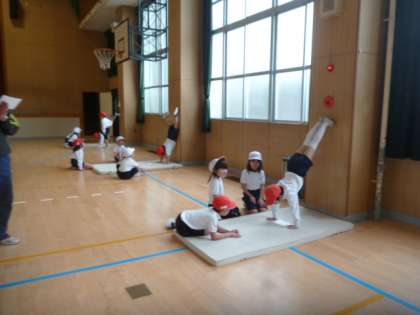 いろいろな動きの運動を楽しみながら、行いました。最後は逆立ちにもチャレンジしました。大きな声で、元気いっぱいに活動しました。