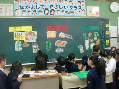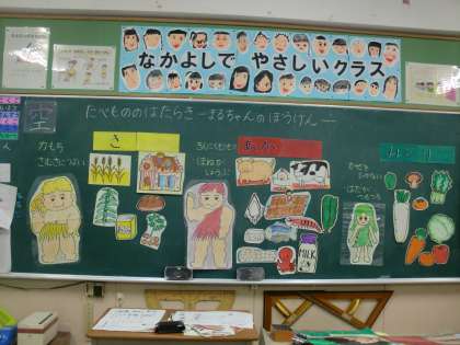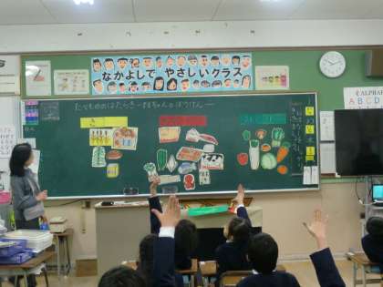 1年生は、キラキラした目で「たべもののはたらき」のお話を聞いています。まるちゃんが、「き」「あか」「みどり」の島を冒険するお話をしたあと、「どの島でとれるたべものでしょう?」と、カードを全員にはってもらいました。すると、ほとんど正解でよく聞いていたことが分かりました。