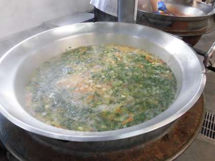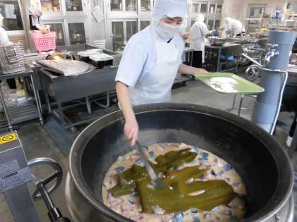 「すまし汁」は、とうふ、冬野菜のだいこんやはくさい、にんじん、彩りにみつばを加えています。給食は、立派なだしこんぶと削り節でしっかり風味のよいだしをとっています。すまし汁にみつばを入れると上品な味になります。みつばは、洗っている時からいい香りがしていたそうです。
