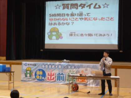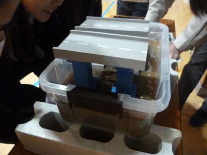 5年生が阪神高速道路公団による出前授業「道路博士」を受けました。5時間目は、高速道路の果たす役割について知りました。関西に入ってくる物資の半分が阪神高速道路を通ってくること、一年間で約2億5千万台も通行していることに驚いていました。後半では、強い橋づくりの工夫や地震の際に起きる液状化の仕組みについて実験から学びました。