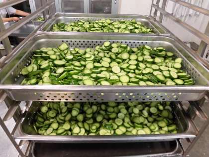 「きゅうりのバジル風味サラダ」は、焼き物機で蒸したきゅうりをバジルのさわやかな風味のドレッシングであえます。バジルは、良い香りがしました。