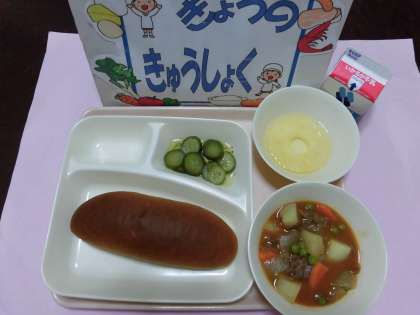 ☆ビーフシチュー・きゅうりのバジル風味サラダ・パインアップル(缶)・黒糖パン・牛乳