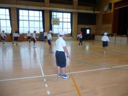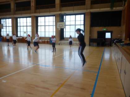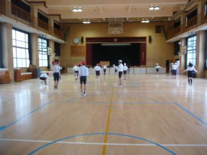 体育館では準備運動で、なわとびをしています。さすがは、6年生いろいろな跳び方ができます。