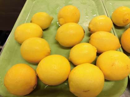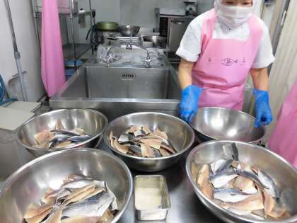 「あじのレモンマリネ」は、年1回使用できるあじをなたね油であげ、いためたたまねぎとレモン汁などで作った調味液をからませます。レモン汁は、最後に加えることで風味を残すようにしています。給食では、国産のレモンを使用しています。今日は小・中合わせて25個使用しました。