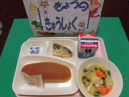 ☆あじのレモンマリネ・てぼ豆のスープ煮・固形チーズ・コッペパン・マーマレード・牛乳