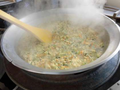 「卵スープ」は、鶏肉、にんじん、もやし、チンゲンサイを煮、液卵を流し入れます。【卵】の個別対応献立です。