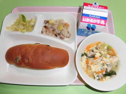 ☆中華おこわ、卵スープ、キャベツのオイスターソースいため・レーズンパン・牛乳