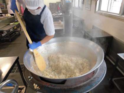 北巽小学校では、ご飯を給食室で炊いていますので、ご飯と具を混ぜていただけます。5回に分けて、偏りがないように丁寧に混ぜていただいています。子どもたちは、混ぜご飯が大好きです。