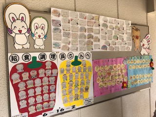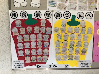 先日行われた給食集会で、調理員さんにお渡ししたメッセージカードが給食室前に貼り出されています。