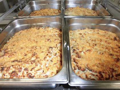 「押麦のグラタン」は、鶏肉を主材に、食物せんいが多く含まれる押麦を使用した手作りのホワイトソースのグラタンです。使用回数や量に制限のあるバターを、今月はこの献立のルウに使用しています。小・中合わせて200gの箱を7つたっぷりと使いました。