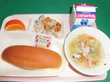☆押麦のグラタン・スープ・いよかん・コッペパン・りんごジャム・牛乳