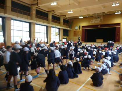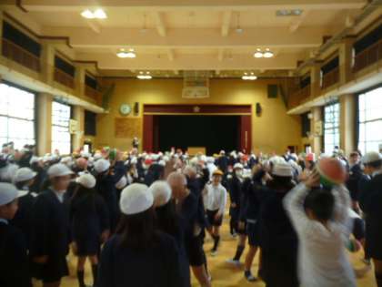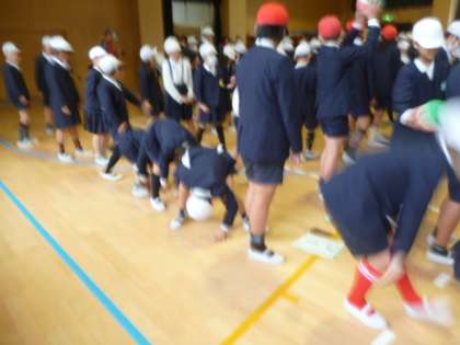 ボール回しゲームをしました。頭の上を通したり、股の間を通したりします。随分と速く回すことができているチームもありました。