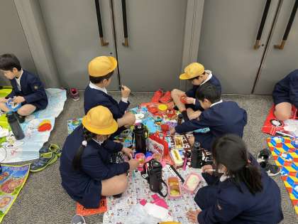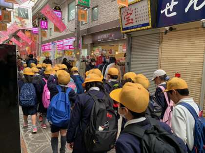 3年生が天神橋筋六丁目にあるくらしの今昔館に社会見学に来ています。途中、日本一長い天神橋筋商店街を見学しています。昼食後、昔のくらしの体験、館内見学に行きます。
