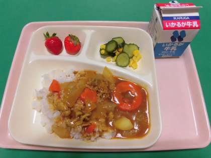 ☆ポークカレーライス・きゅうりとコーンのサラダ・いちご・ご飯・牛乳