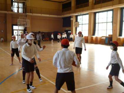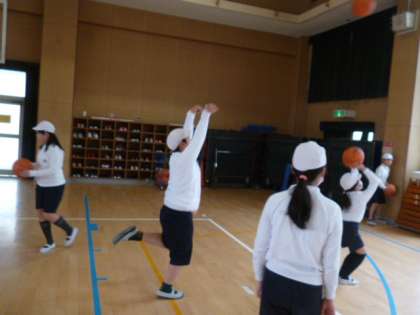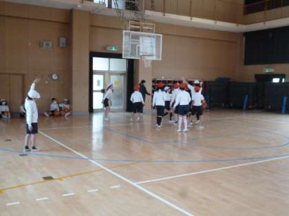 体育館ではバスケットボールをしています。最初、シュート練習をしてから、試合をしました。こちらもパスがつながり、試合らしくなってきました。