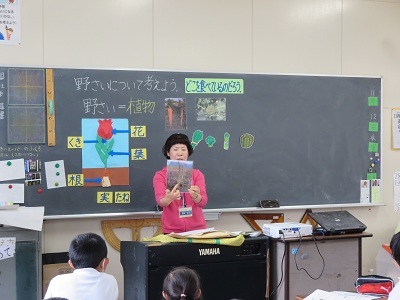 本日、栄養教諭による食に関する指導が行われました。 内容は「野菜はどこを食べているのだろうか」です。