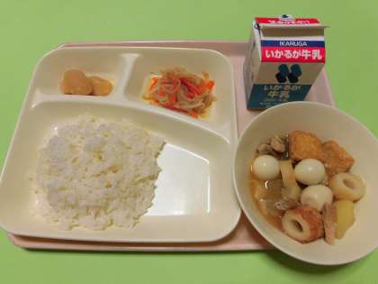 「関東煮」は、鶏肉、うずら卵、ちくわ、じゃがいも、こんにゃく、あつあげ、だいこんを使用しています。 この献立は 【うずら卵】の個別対応献立です。