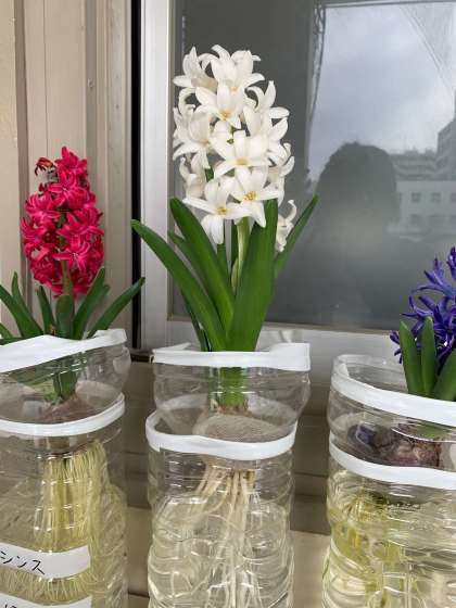 白(しろ)は根(ね)っこが太(ふと)いから大(おお)きなお花(はな)が咲(さ)きましたね。みんなが水(みず)をかえて、入れ物(いれもの)を洗(あら)ってお世話(せわ)をしてくれたおかげです。ありがとう!