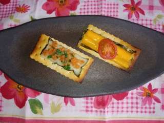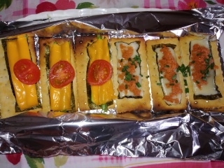 クラッカーに、のり、チーズ、プチトマトやグリーンアスパラガス、のびる(ねぎのしゅるい)、サケのフレークなどすきなものを何(なん)でもトッピングして家族(かぞく)で楽(たの)しめます。
