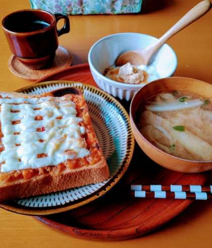 手(て)づくりのミートソースがいきいていますね。チーズって、色々(いろいろ)な形(かたち)にアレンジできるのですね!楽(たの)しく工夫(くふう)できる朝(あさ)ごはんです。きなこを入(い)れたヨーグルトも、おなかの調子(ちょうし)をよくしてくれますね!