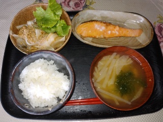 ・ごはん・みそしる・さけの塩(しお)やき・サラダ です。