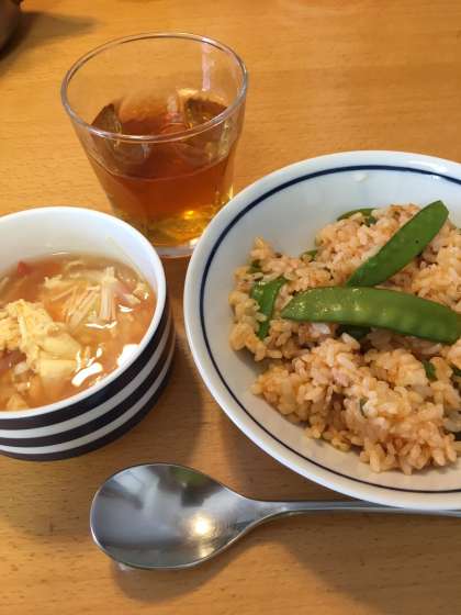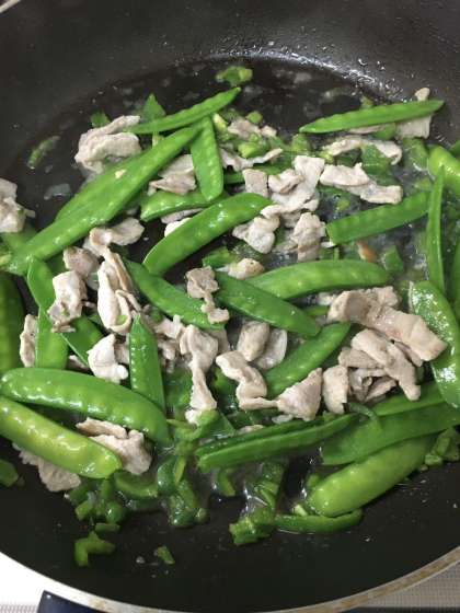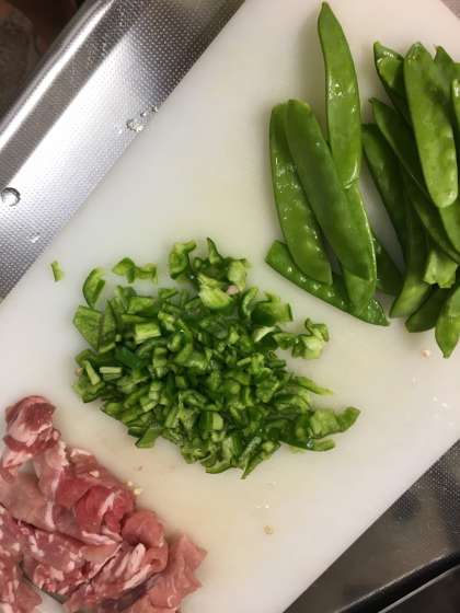 冷蔵庫(れいぞうこ)のすみに残(のこ)っていたピーマンと安売(やすう)りの豚(ぶた)ロース肉(にく)。ごはんも昨日(さくじつ)の晩(ばん)のものが残(のこ)っていました。それに実家(じっか)の徳島(とくしま)の父(ちち)が作(つく)ったスナップエンドウ。下(した)の子(こ)が筋(すじ)をとるのをお手伝(てつだ)い。これは、あえて切(き)らずにいれました。