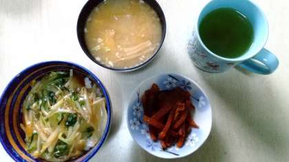 中華風(ちゅうかふう)にしたものに、みそ汁(しる)をそえました。副菜(ふくさい)は大根(だいこん)とうすあげの炒(いた)め煮(に)です。