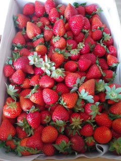 箱(はこ)にたっぷりはいった旬(しゅん)のいちごを買(か)ってきました。