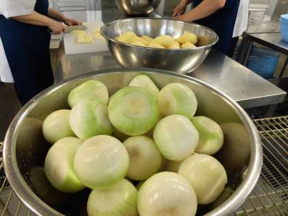 「みそ汁」は、だしこんぶとけずりぶしでたっぷり香りのよいだしをとりました。じゃがいも、たまねぎ、乾燥わかめを使用しています。給食のみそ汁は赤みそと白みそを合わせて味に深みを出しています。