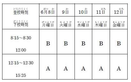 6月8日〜6月12日までの登下校の時刻は、上の表のようになっておりますのでご確認ください。
