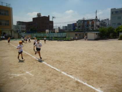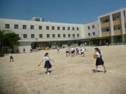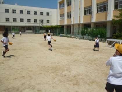 今日は風が吹いていて、気持ちのいい天気だったので、たくさんの人が運動場で遊んでいます。