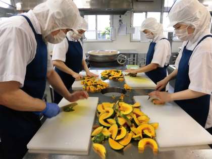 「かぼちゃのクリームシチュー」は鶏肉、ベーコンを主材に、給食では6月から使用できる旬のかぼちゃを使用しています。今日は、小学校だけで大きいかぼちゃを10個使っています。食べてみると、くずれやすいかぼちゃも、口の中に入れて初めて溶けていく感じで、とても美味しく仕上がっていました。子どもたちにも大人気でしたょ。