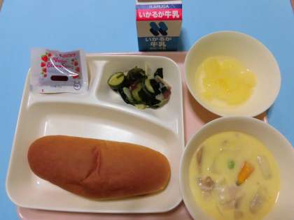 ★かぼちゃのクリームシチュー・ミックス海そうのサラダ・りんご(カット缶)・コッペパン・いちごジャム・牛乳