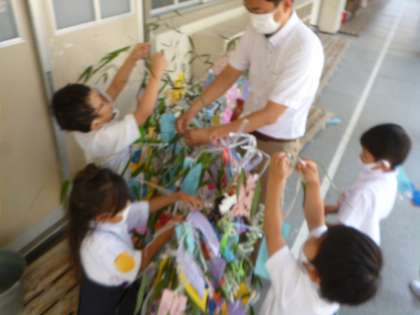 七夕でかざる短冊をつくった後に、ササに飾り付けをしています。かわいい飾り付けをすることができました。いろいろな願い事を書いてくれました。また、おうちでどんな願い事を書いたのか聞いてみてくださいね。