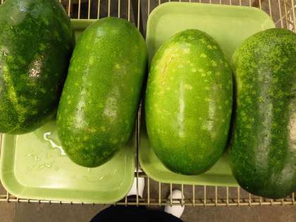 「とうがんのみそ汁」は、夏が旬のとうがんとオクラの入ったみそ汁です。みそ汁の具はとうがんがわかりやすいように、少なめにしています。とうがんは、大きなものを小・中合わせて9個使いました。